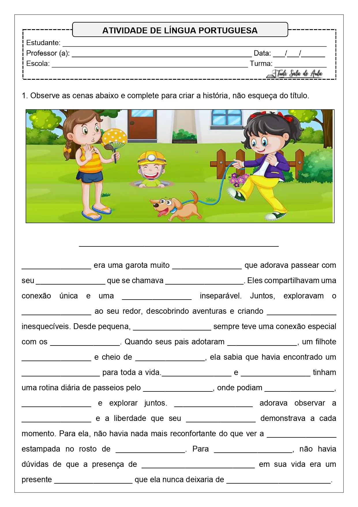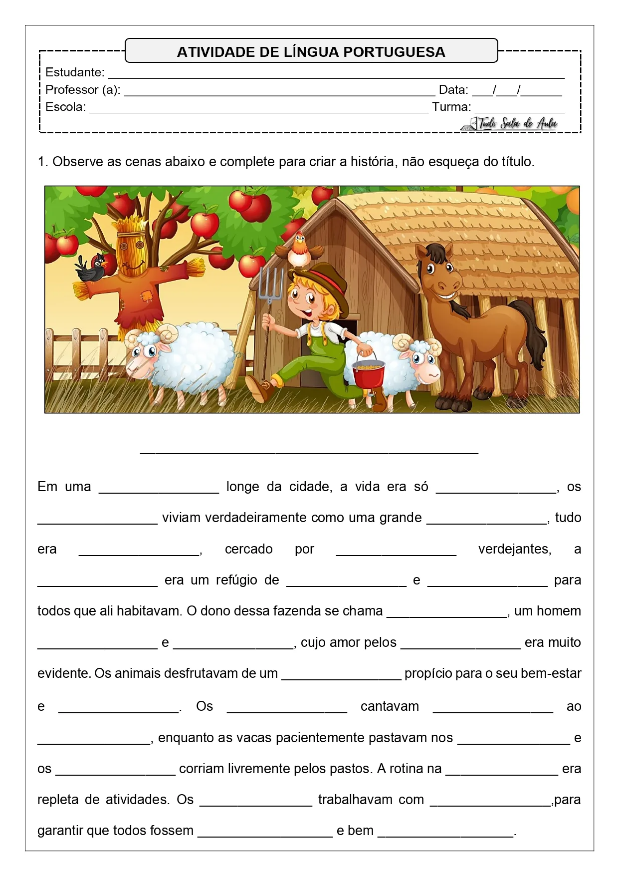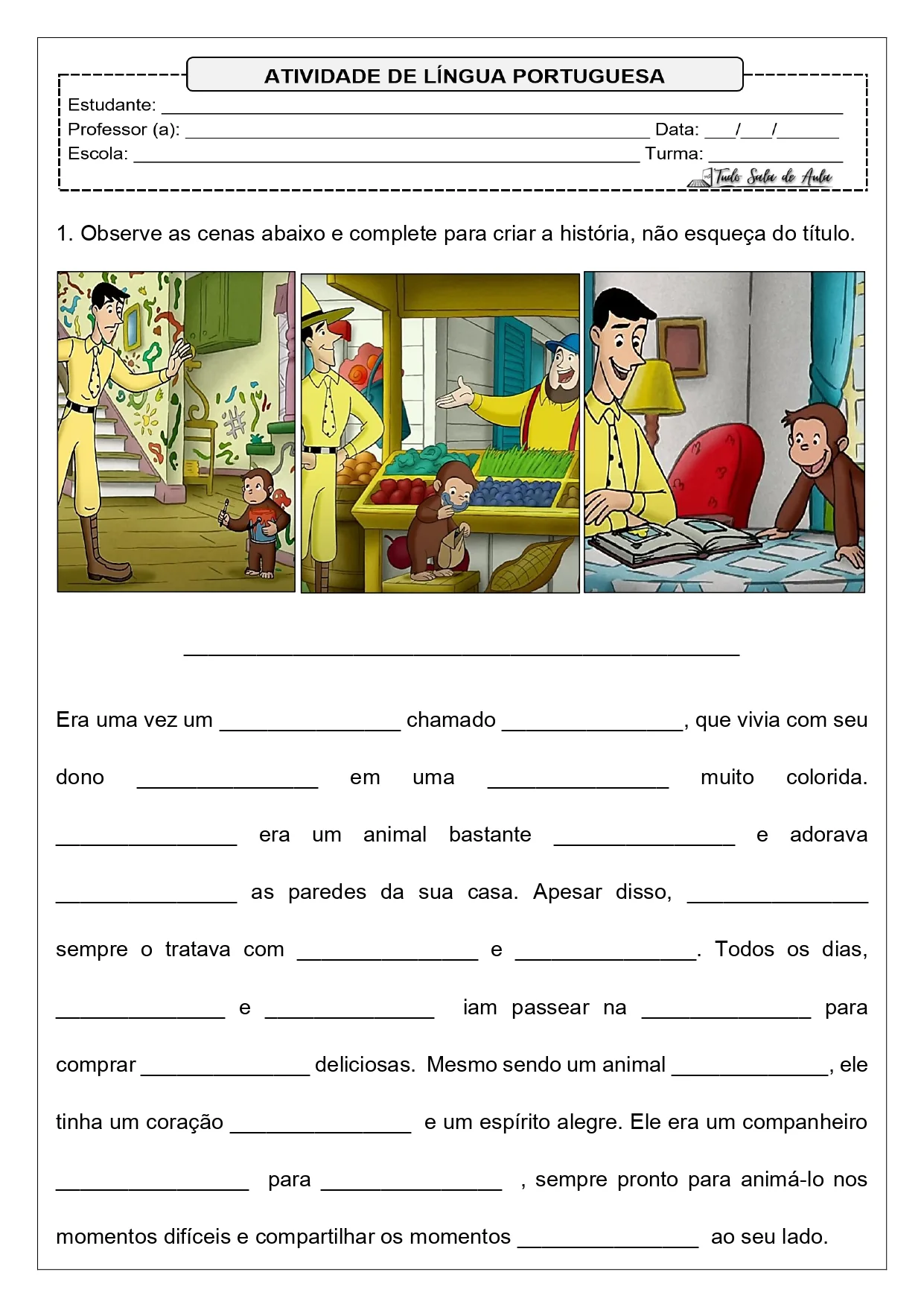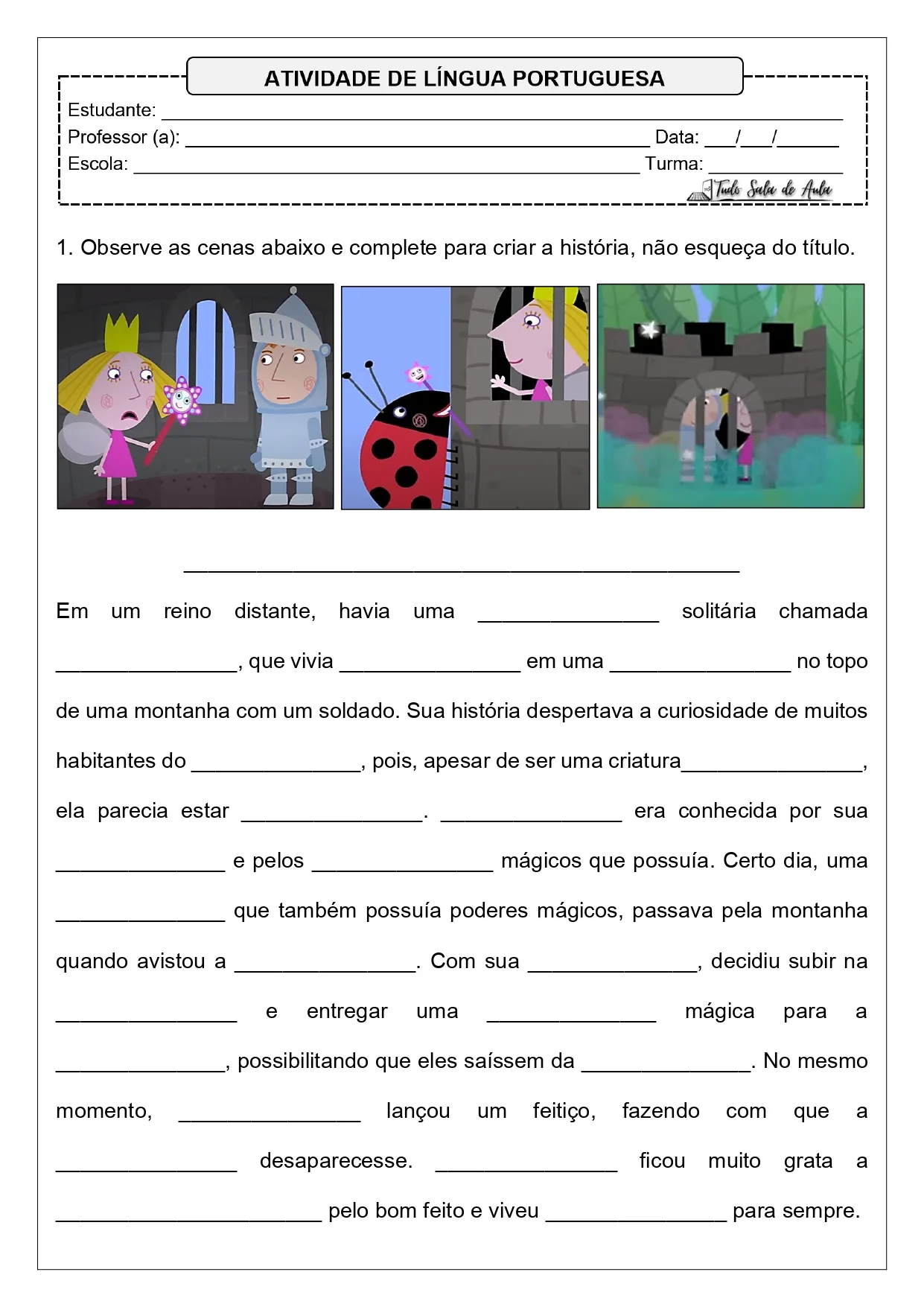 As atividades a seguir de produção textual para completar tem como objetivo principal desenvolver a criatividade e a capacidade de organização dos alunos, incentivando-os a concluir histórias ou textos de forma coesa e com sentido. Abaixo, apresentamos vários modelos.