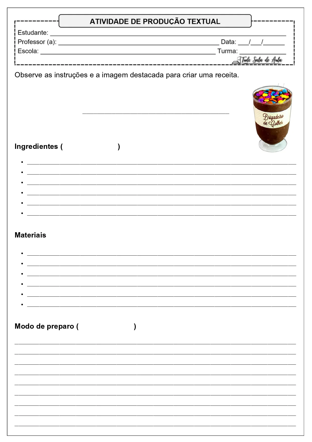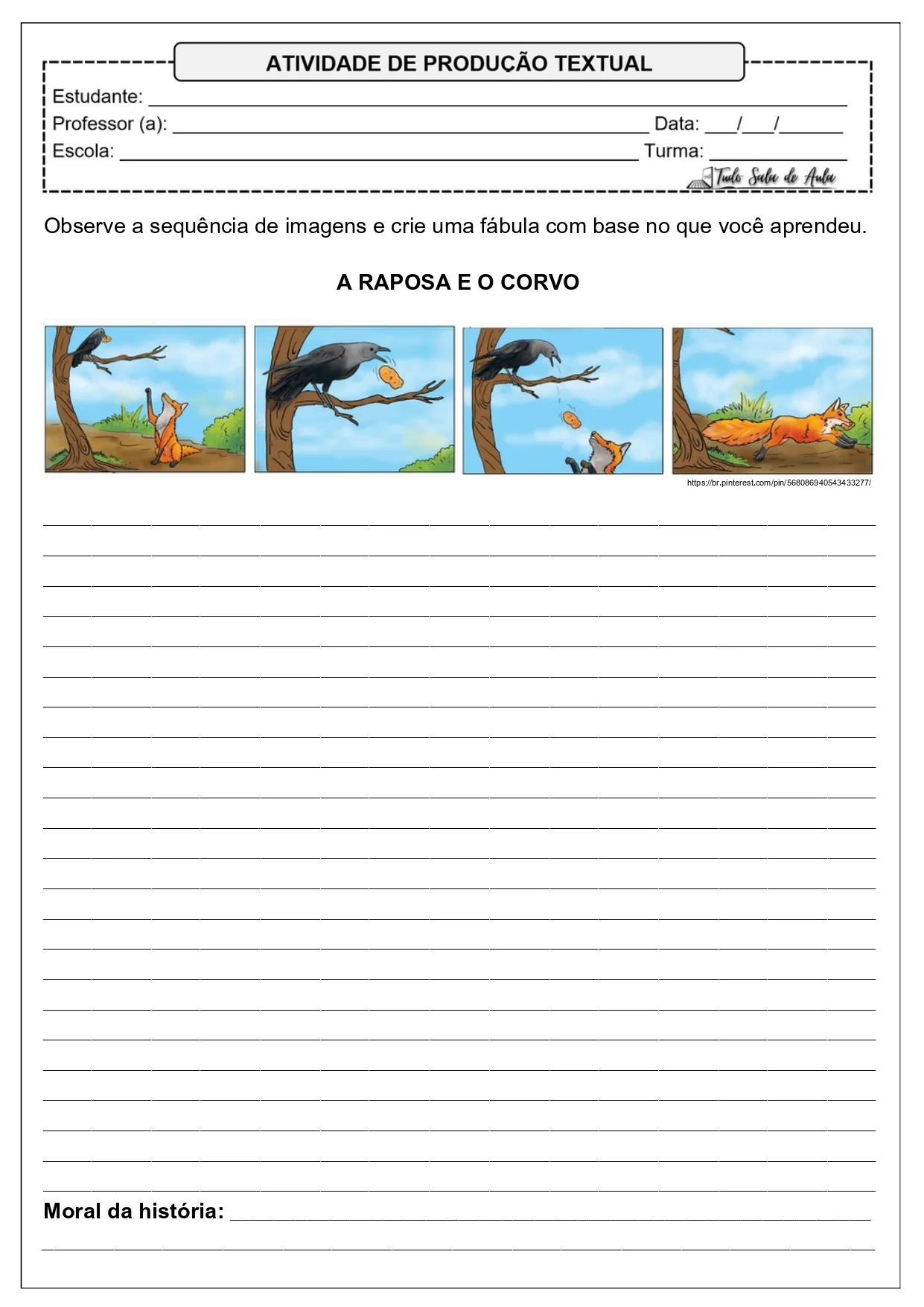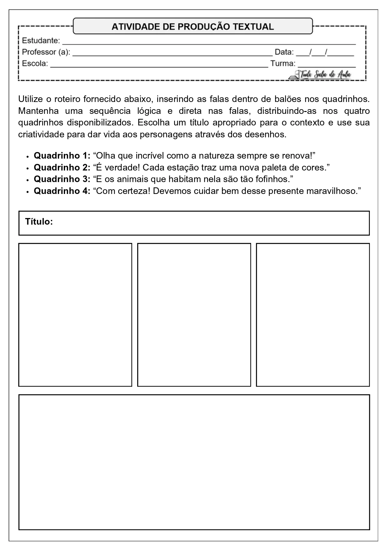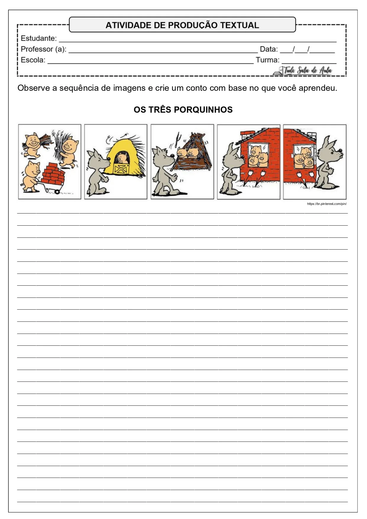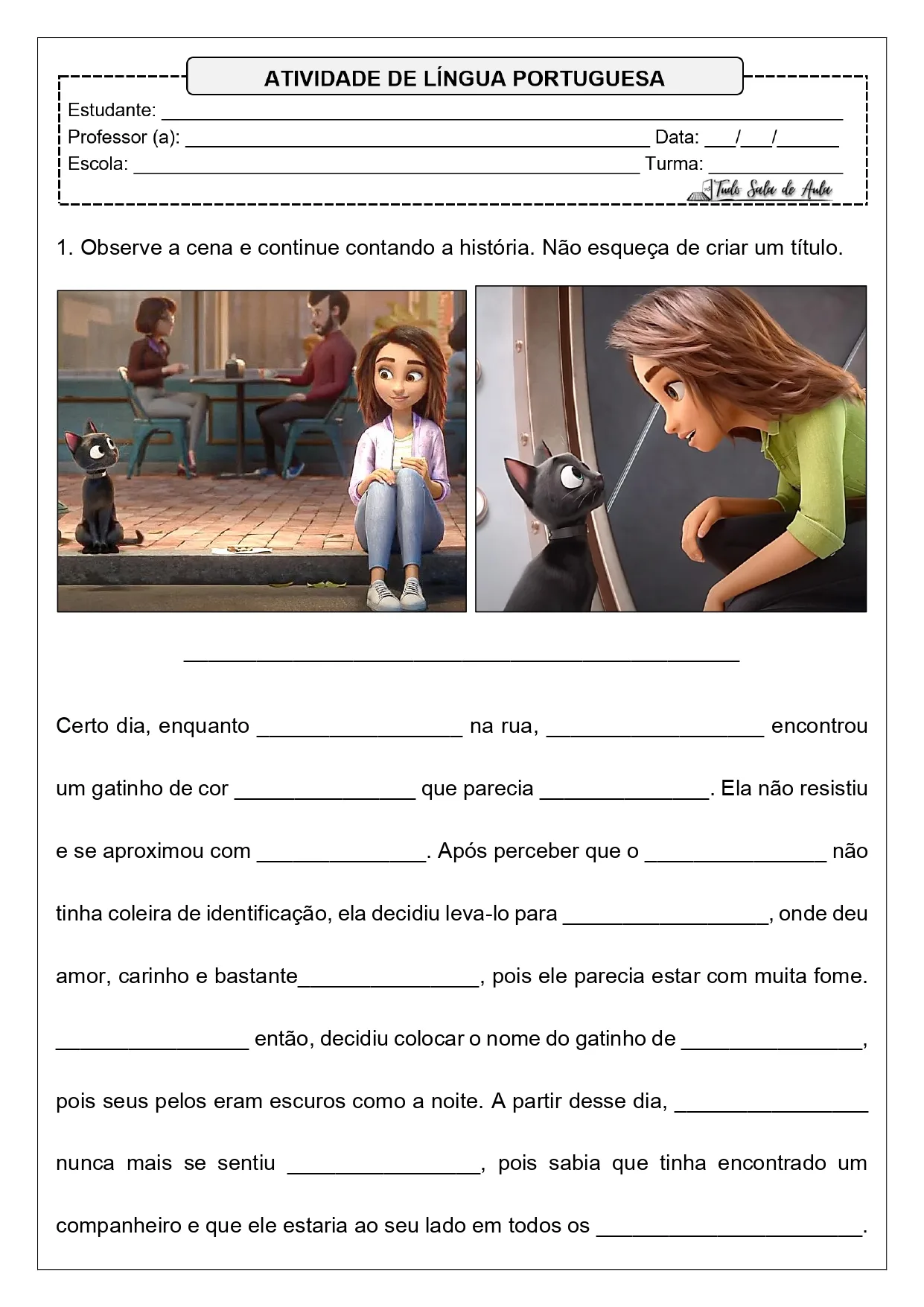 As atividades a seguir de produção textual para completar tem como objetivo principal desenvolver a criatividade e a capacidade de organização dos alunos, incentivando-os a concluir histórias ou textos de forma coesa e com sentido. Abaixo, apresentamos vários modelos.
