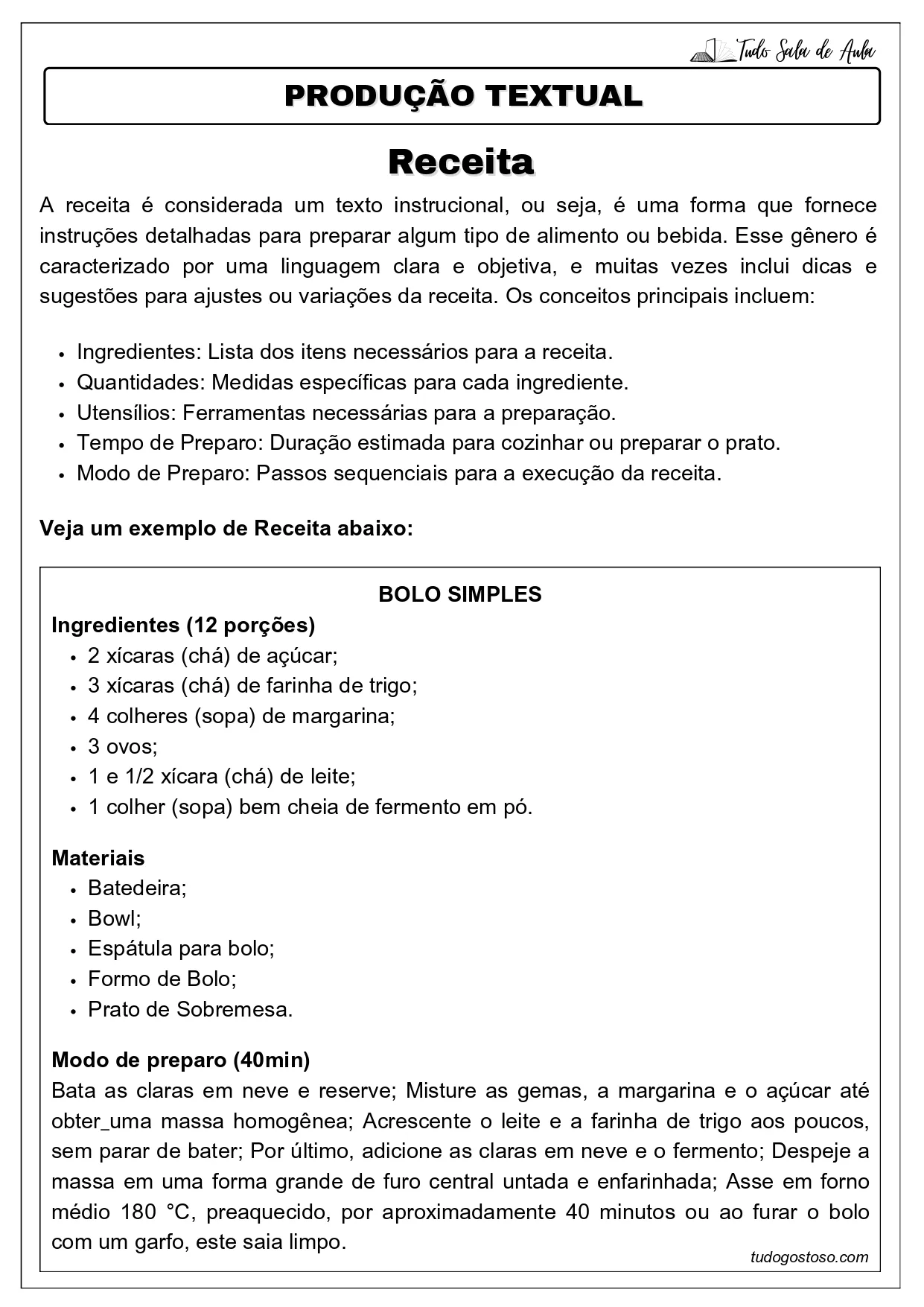 A atividade de produção textual do gênero receita tem como objetivo principal desenvolver a habilidade dos alunos em organizar informações de forma clara e sequencial.