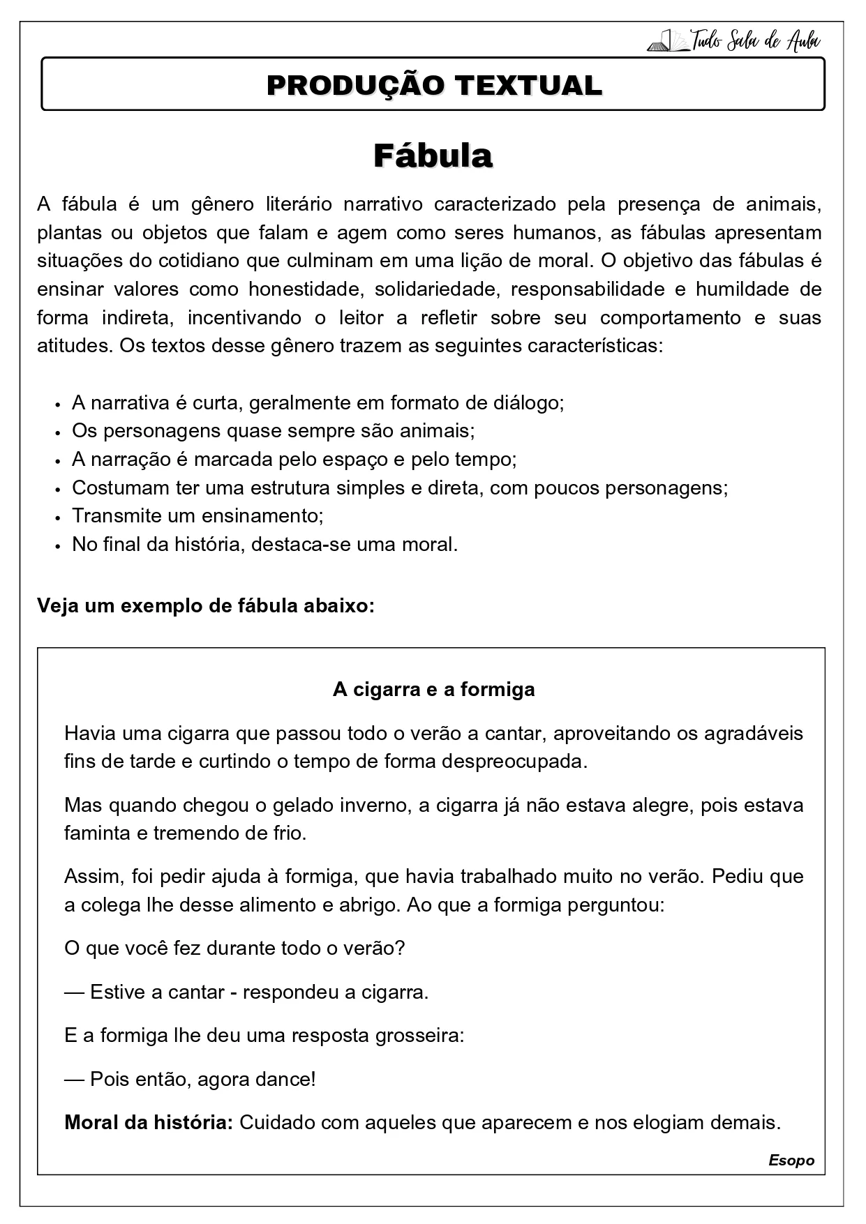 A atividade de produção textual do gênero fábula tem como objetivo principal desenvolver a criatividade dos alunos, incentivando a criação de histórias curtas com personagens animais e uma lição moral.