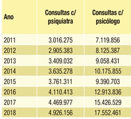 5. Em 2018, quantas consultas a mais foram realizadas com psicólogos em comparação com psiquiatras?