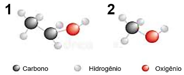 1. A fórmula do metanol é CH₃OH, enquanto a do etanol é CH₃CH₂OH. Observe as moléculas apresentadas e identifique qual corresponde ao metanol e qual ao etanol.