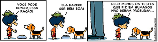 d) diz que testou a ração em humanos, o que é inesperado e engraçado.