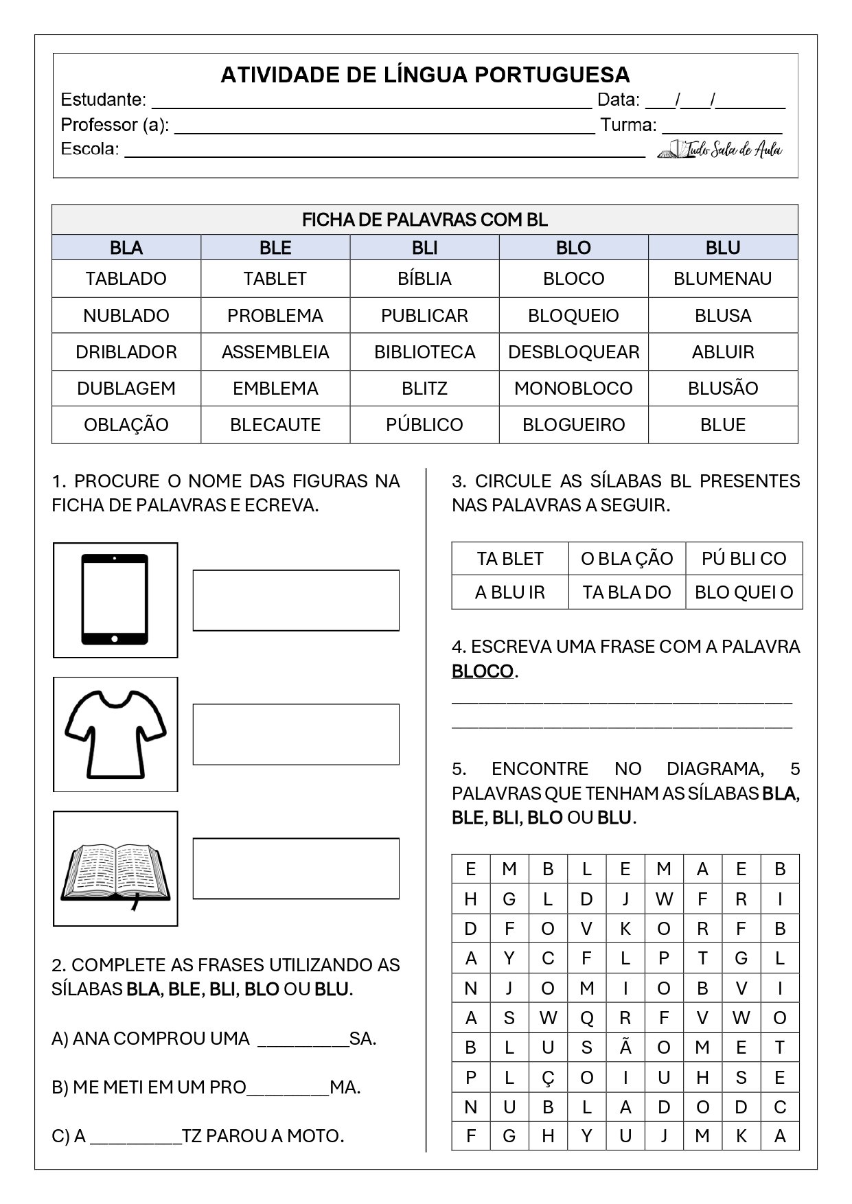 Nesta atividade, os alunos deverão identificar e escrever nomes de figuras com bl, completar frases com sílabas adequadas, circular sílabas complexas em palavras e até formar frases próprias. A proposta visa consolidar o reconhecimento e o uso das sílabas iniciadas por bl de maneira lúdica e significativa.
