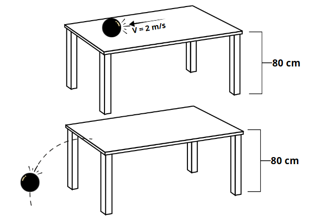 1. Uma bolinha se movimenta com velocidade v = 2 m/s sobre a superfície plana e horizontal de uma mesa de 80 cm de altura. Imediatamente após perder o contato com o plano da mesa, a bolinha vai em direção ao chão em trajetória curvada.