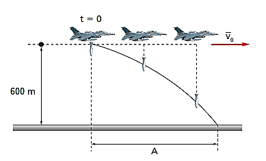 Um avião de guerra voa a 600 m de altura, horizontalmente, com uma velocidade constante de 100 m/s, num local onde a aceleração da gravidade é g = 10 m/s². Em um determinado instante, uma bomba se desprende livremente do avião.