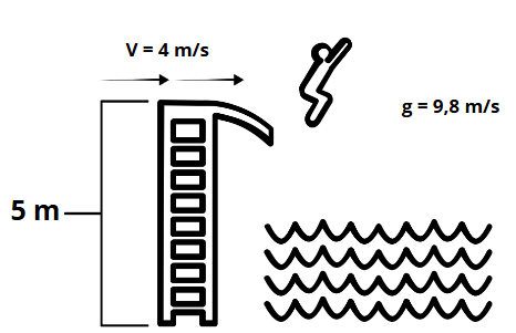2. Um mergulhador ornamental, em seu treinamento, prepara-se para um salto horizontal de uma plataforma com 5 metros de altura. Para ganhar impulso, ele corre e atinge uma velocidade inicial de 4 m/s no momento exato do salto.