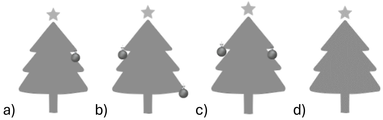 4. Júlia estava colocando bolinhas nas pontas das folhas da sua árvore de Natal. Ela colocou e retirou os enfeites algumas vezes.
