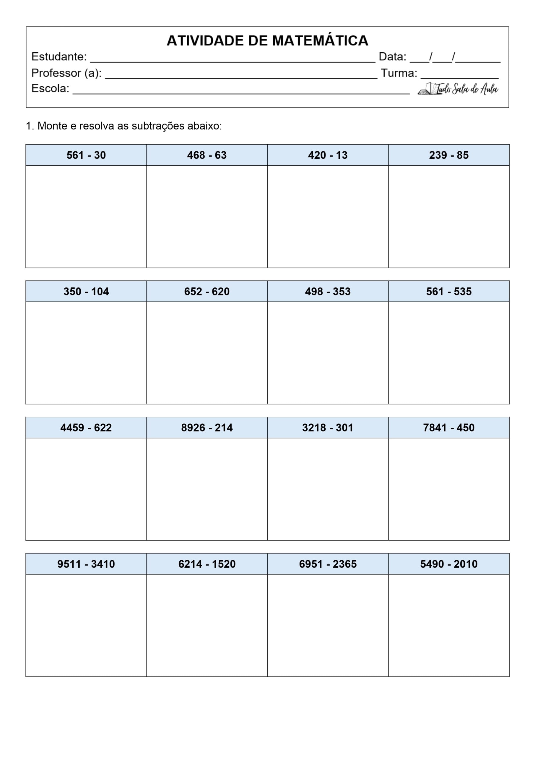 Atividade sobre subtração, com situações que envolvem cálculos simples e complexos, incentivando a organização das contas, o uso correto do algoritmo e a consolidação do pensamento matemático.